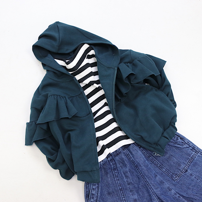 フリルのボリュームで一見厚手に見えるパーカー。