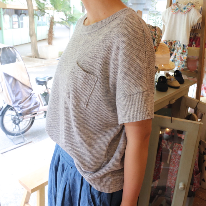 ワッフルニットのカットソーは肩の落ちるデザインで華奢な表情に。